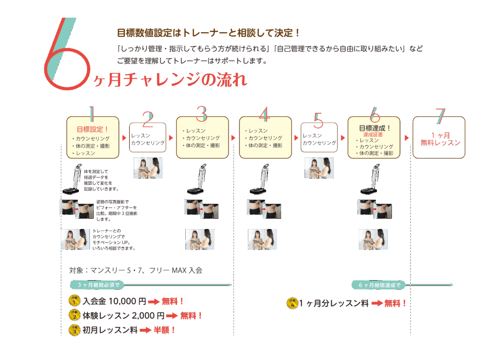 内容:入会月から6ヶ月後に初回レッスンで立てた、目標をクリアします。